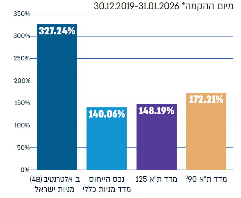 מנהל הקרן: איילון קרנות נאמנות בע"מ. מנהל השקעות חיצוני: בסט אלטרנטיב ניהול תיקים בע"מ. *הקרן הונפקה ביום 29.12.19, יובהר כי בהתאם להוראות הרשות לני"ע, היום הראשון לצורך קביעת תחילת של תקופת חישוב התשואה הוא היום לאחר היום שבגינו נרשמו לראשונה יצירות בקרן. **להערכת מנהל ההשקעות החיצוני ע"פ ניתוחים כלכליים. #אין באמור התחייבות להשגת תשואה כלשהי. ^ עד ליום 06.07.21 פסגות קרנות נאמנות בע"מ שימשה כמנהל הקרן.1. 4 – עד 120% חשיפה למניות בערך מוחלט מהשווי הנקי של נכסי הקרן. B – עד 30% חשיפה למט"ח בערך מוחלט מהשווי הנקי של נכסי הקרן. 2. בתאריך 01.07.21 בוצע עדכון רשימת הכותרות המאפיינות לצורך סיווג קרנות. לפי נתוני מערכת פרדיקטה בקטגוריה מניות בארץ, מניות לפי שווי שוק, מניות All cap מתוך 36 קרנות שפורסמו להן תשואה ושארפ לתקופה זו. 3. ממוצע החשיפה למדד זה לתקופה זו היתה כ-24%. פרסום זה אינו מהווה הצעה לרכישת יחידות בקרנות ואינו מהווה תחליף לייעוץ/שיווק השקעות ו/או מס המתחשב בנתונים ובצרכים המיוחדים לכל אדם. רכישת יחידות נעשית בהתאם לתשקיפי הקרנות שבתוקף ולדיווחים המידיים. אין בתשואות ובמיקומי הקרנות בעבר כדי להעיד על תשואות ומיקומים דומים בעתיד.